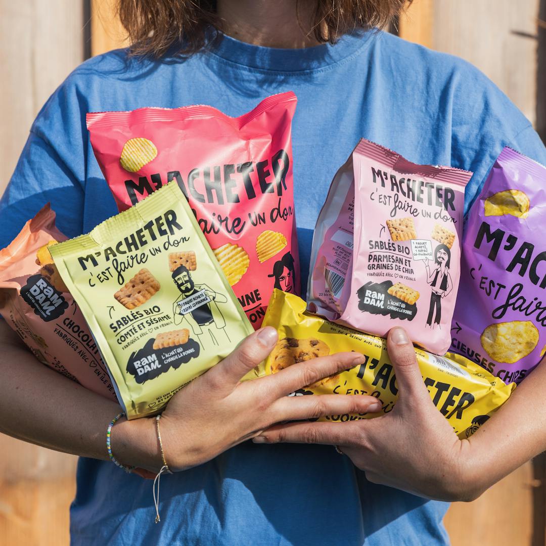 Ramdam Social, c’est l’alliance audacieuse entre consommation quotidienne et solidarité concrète. Chaque produit Ramdam acheté génère un don immédiat pour une personne en situation de précarité : un paquet de sablés achété = un repas co-financé pour le secours populaire, 1 produit d’hygiène acheté = 1 journée de protections périodiques offertes.